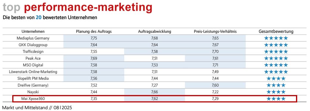 „Dass wir im Outsourcing-Ranking 2025 von Markt und Mittelstand zu den Top 10 im Bereich Performance-Marketing zählen, ist eine starke Bestätigung unserer Arbeit. Der Mittelstand steht im digitalen Marketing heute vor der Herausforderung, immer komplexere Kanäle effizient zu steuern. Genau hier schafft strategisches Outsourcing echten Mehrwert: Unternehmen gewinnen durch spezialisierte Agenturpartnerschaften Zugang zu geballtem Fachwissen, modernster Technologie und skalierbaren Ressourcen – ohne die eigenen Strukturen zu überlasten.